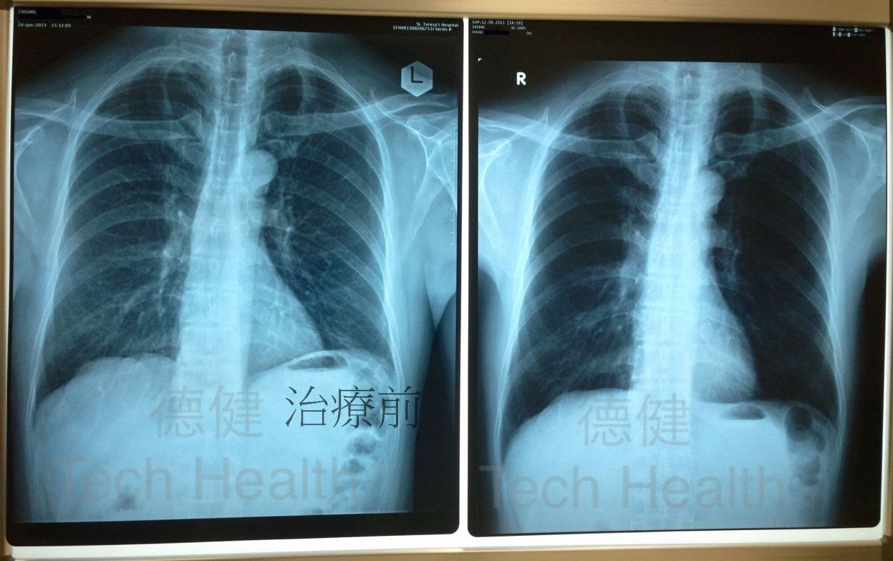 患者經過45次經穴激活系統療法的組合治療後,所有不適症狀均已消除,從覆檢的X光片中,可見肺部組織纖維化部份有95%以上回復正常,而患者亦已回復正常生活,且生活質素良好。