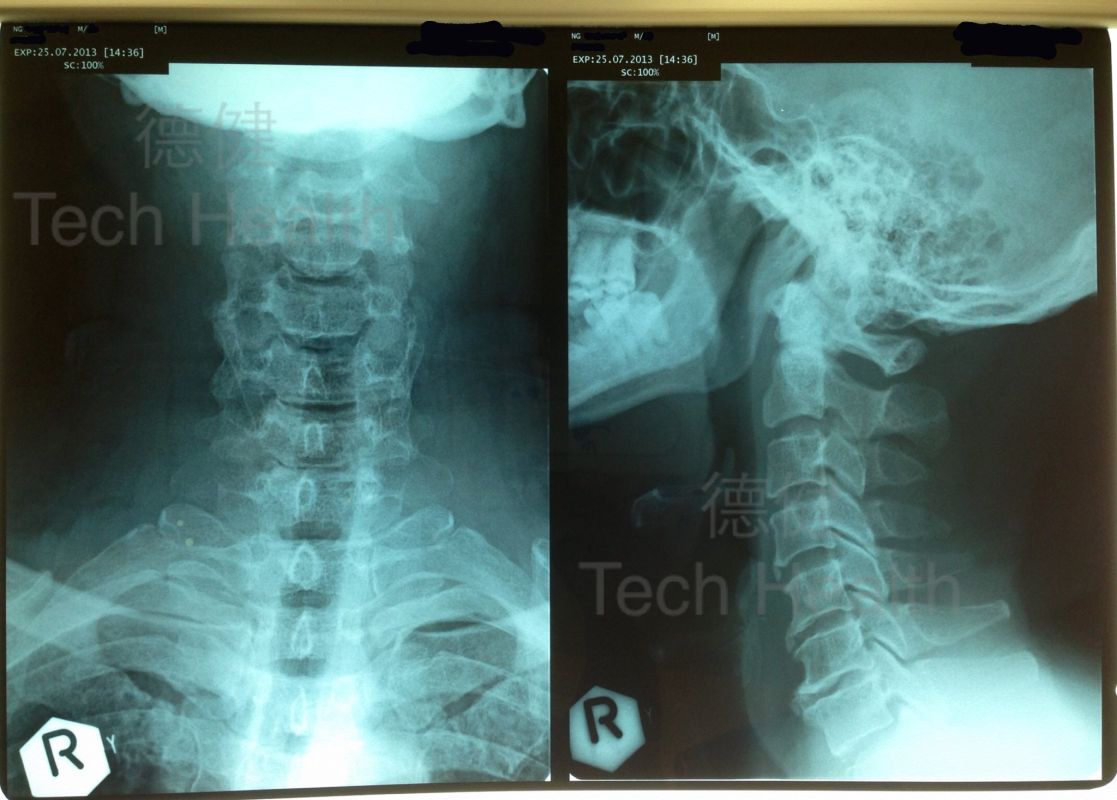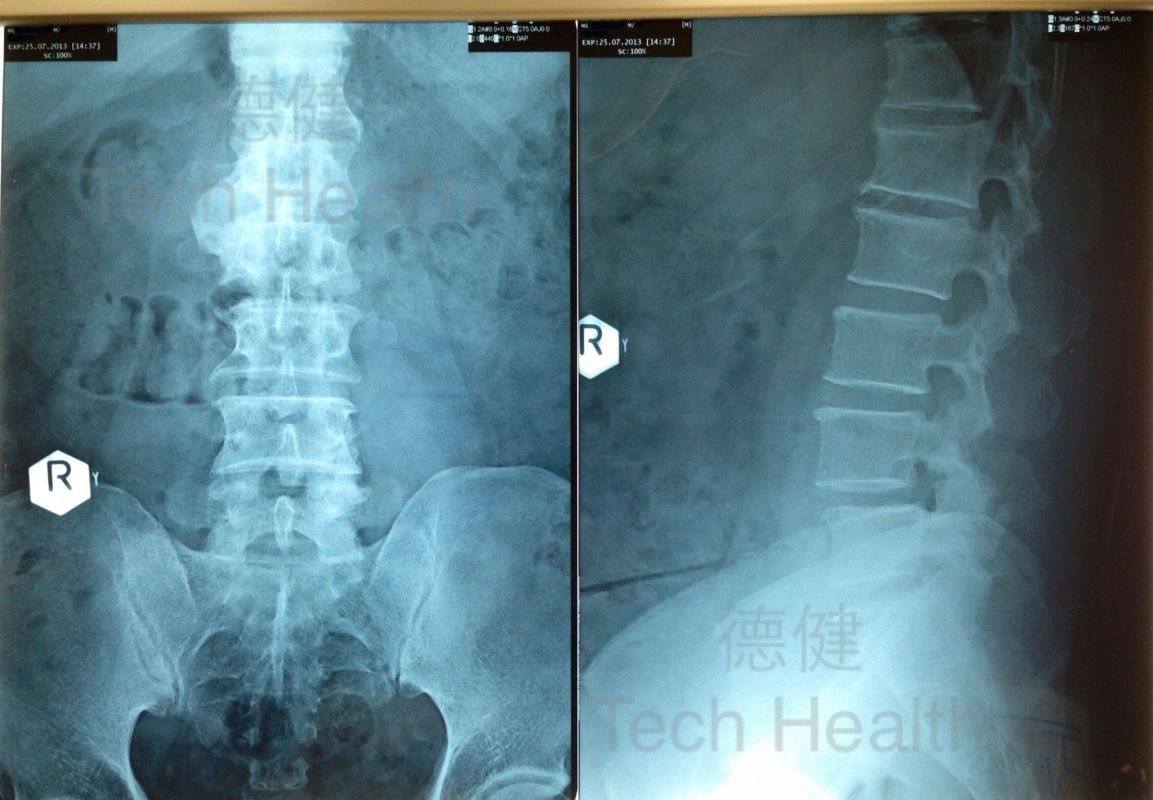 從X光片檢查發現患者頸椎骨痛影響右肩抽痛,腰椎骨L4~L5肌肉及軟組織不正常,神經受壓,引致患者右腰外側疼痛及右腳抽痛,晚間時有抽筋情況出現。- 2013/07/24 初診。患者經過1次經穴激活系統療法的組合治療後,疼痛感覺明顯減輕,當日覺舒服約三小時 。